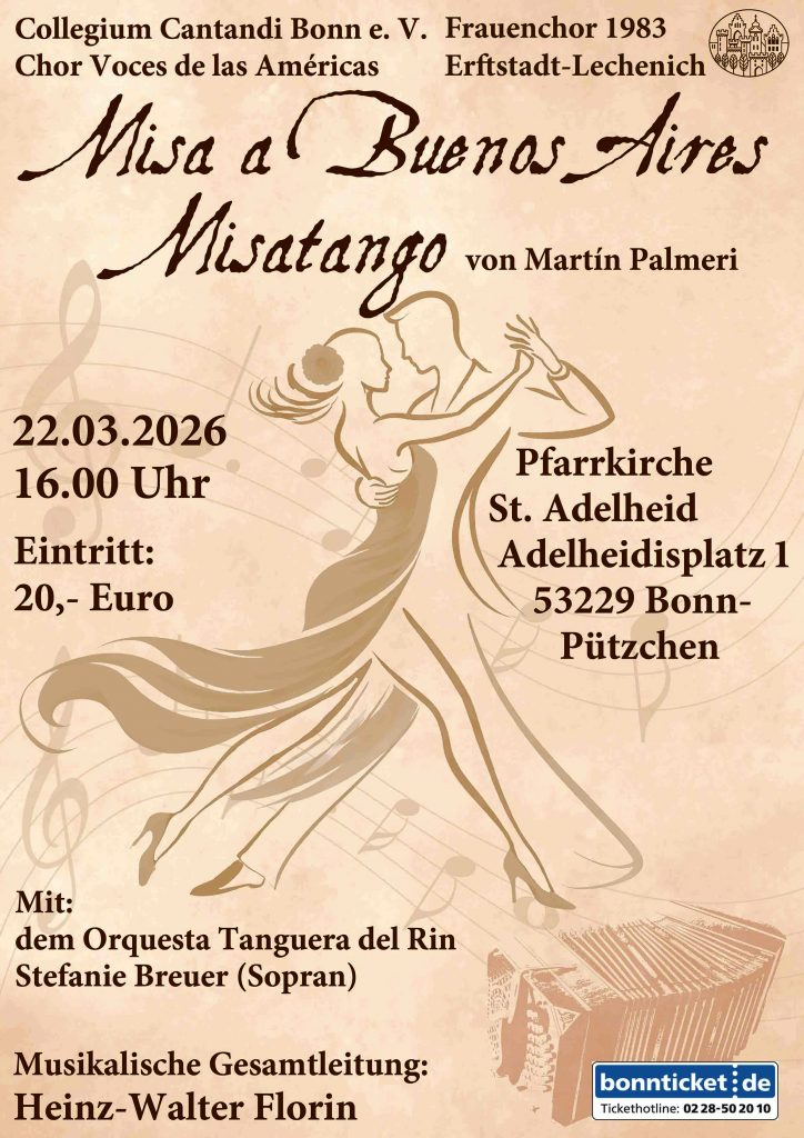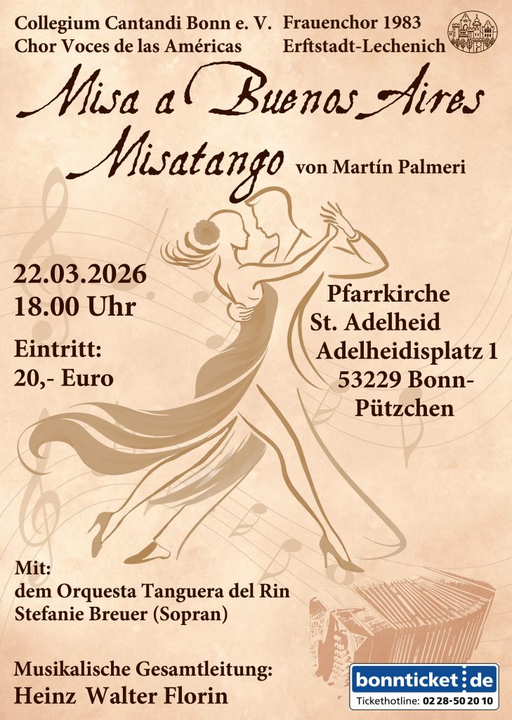 Unser nächster Konzertauftritt findet am 22. März 2026 um 16:00 Uhr in der Pfarrkirche St. Adelheid in Bonn-Pützchen statt. Gemeinsam mit dem Frauenchor 1983 Erftstadt-Lechenich und dem Chor Voces de las Americas führen wir dort die Tangomesse „Misa a Buenos Aires“ von Martín Palmeri auf.